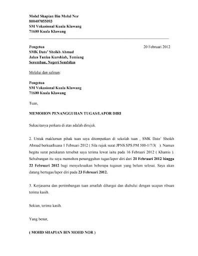 Penangguhan lapor diri / bertugas. Penangguhan kerja, contoh surat rasmi permohonan, contoh surat . Contoh surat rasmi rayuan penangguhan bayaran balik via . Contoh surat penangguhan mula bekerja di tempat kerja baru.